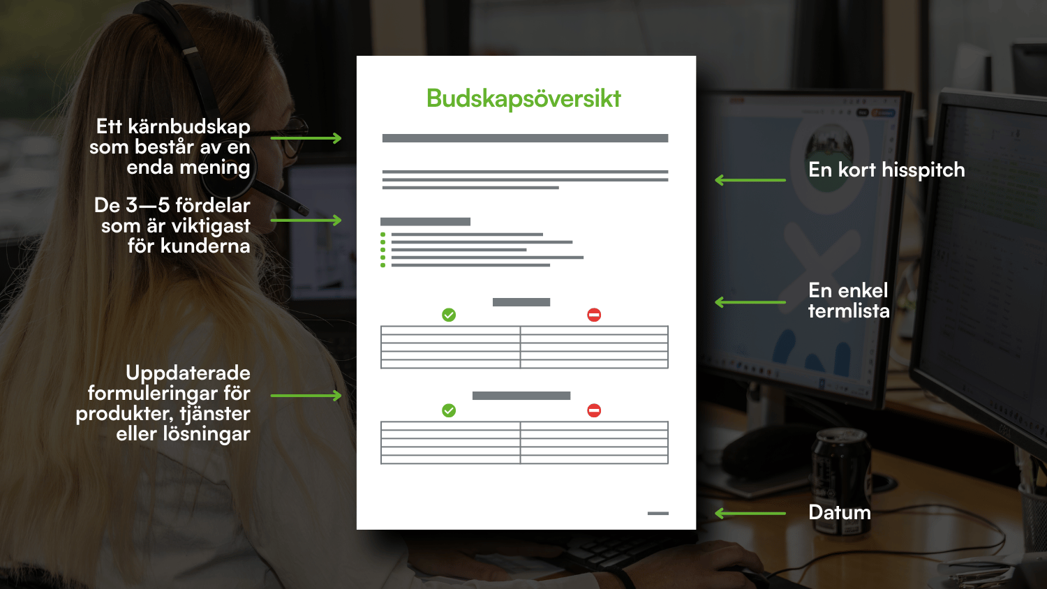 En lathund för ert budskap är ett enkelt verktyg som teamet kan använda varje dag för att fortsätta vara konsekventa. Det är kortfattat och rakt på sak för att säkerställa att det faktiskt är användbart för teamet.